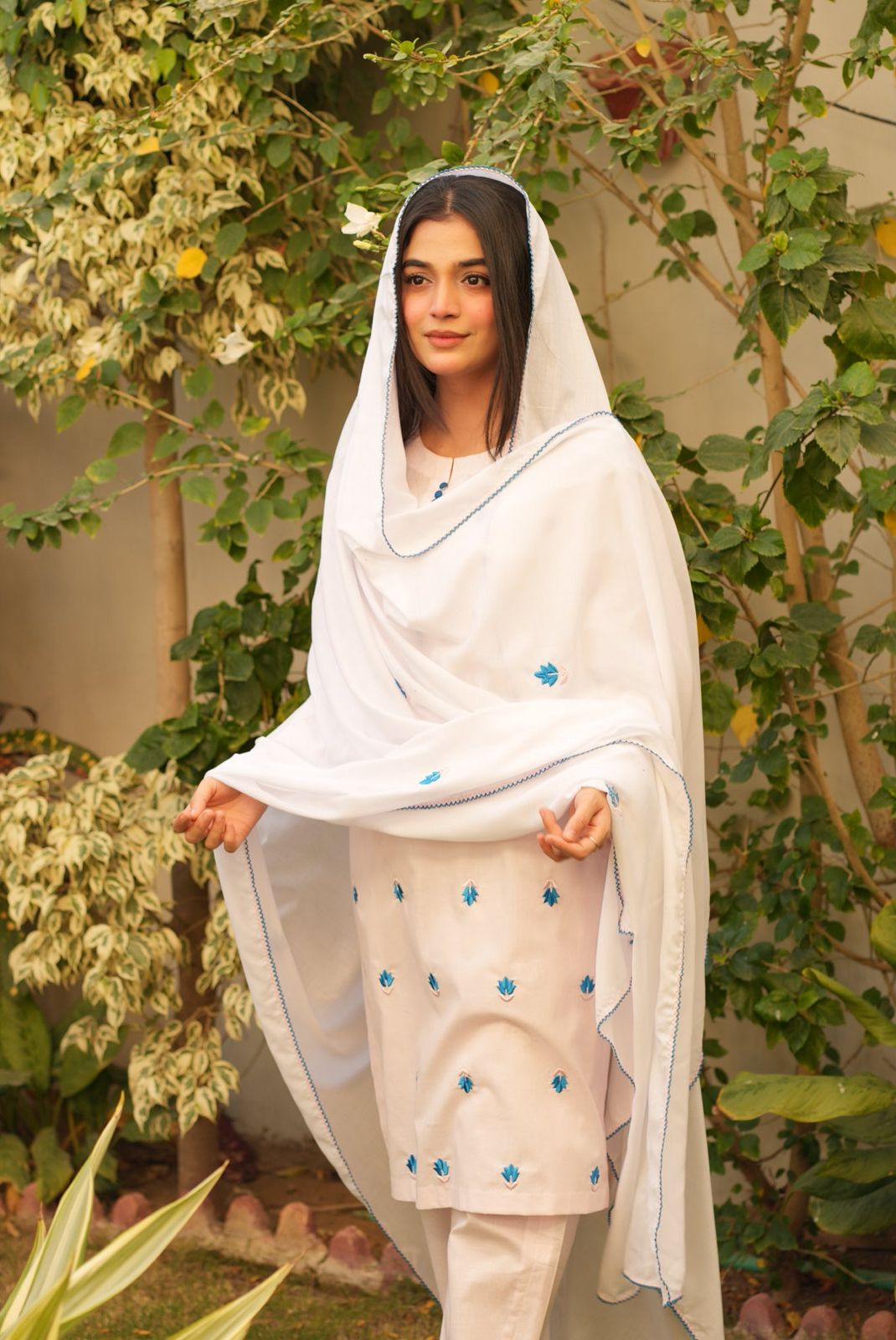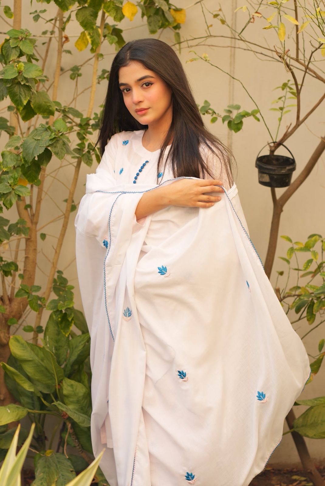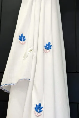 A gentle spread of blue blossoms on our softest baby pink kurta paired with plain baby pink pants and Elaya’s signature white chaadar